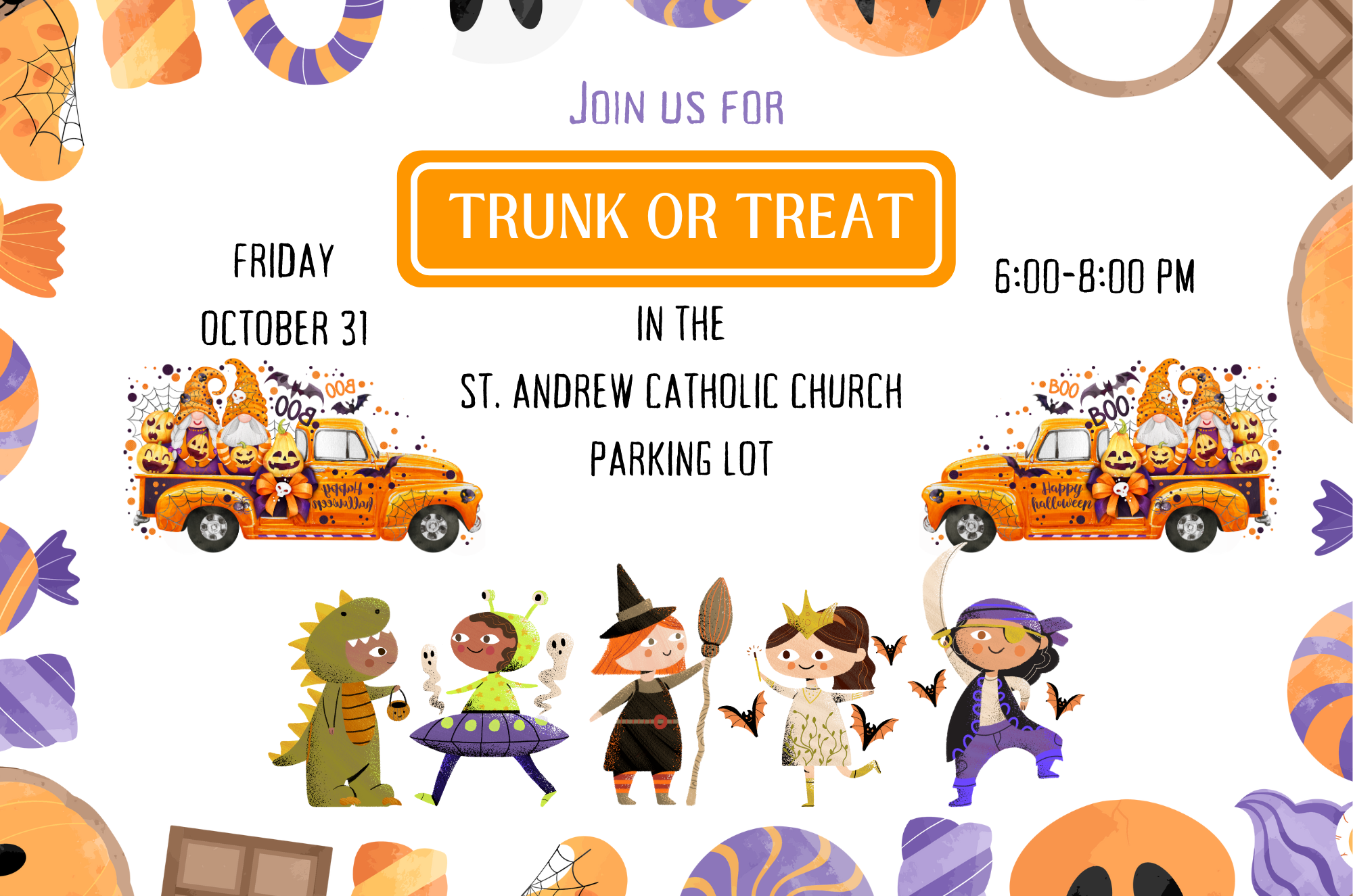 Join us for Trunk or TreatFriday, October 31, 6:00 PM-8:00 PMIn the St. Andrew Catholic Church Parking Lot. Click 'Read More' for more information. We…